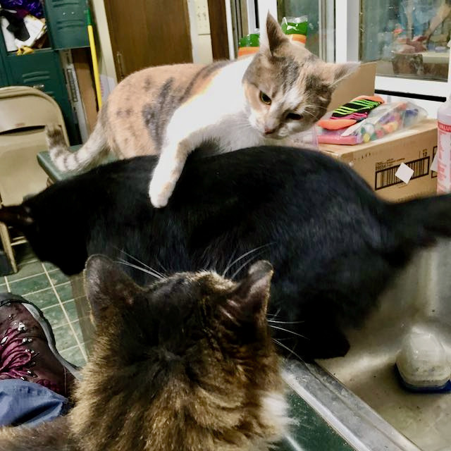 That’s what I told the three cats, thinking they wouldn’t believe me. But they worked out the logistics themselves. The tabby stayed put in my lap, the black cat sat on my shins and the calico decided it was more fun to sit on the counter and swat at everyone else. We all settled in for the meditation session … just as it was, which is what the Let Animals Lead® method is about anyway.